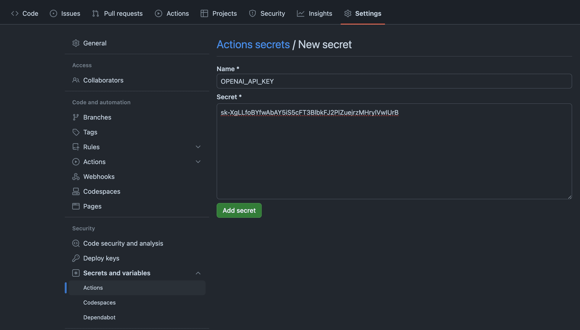 - Enter OPENAI_API_KEY as the value obtained earlier.