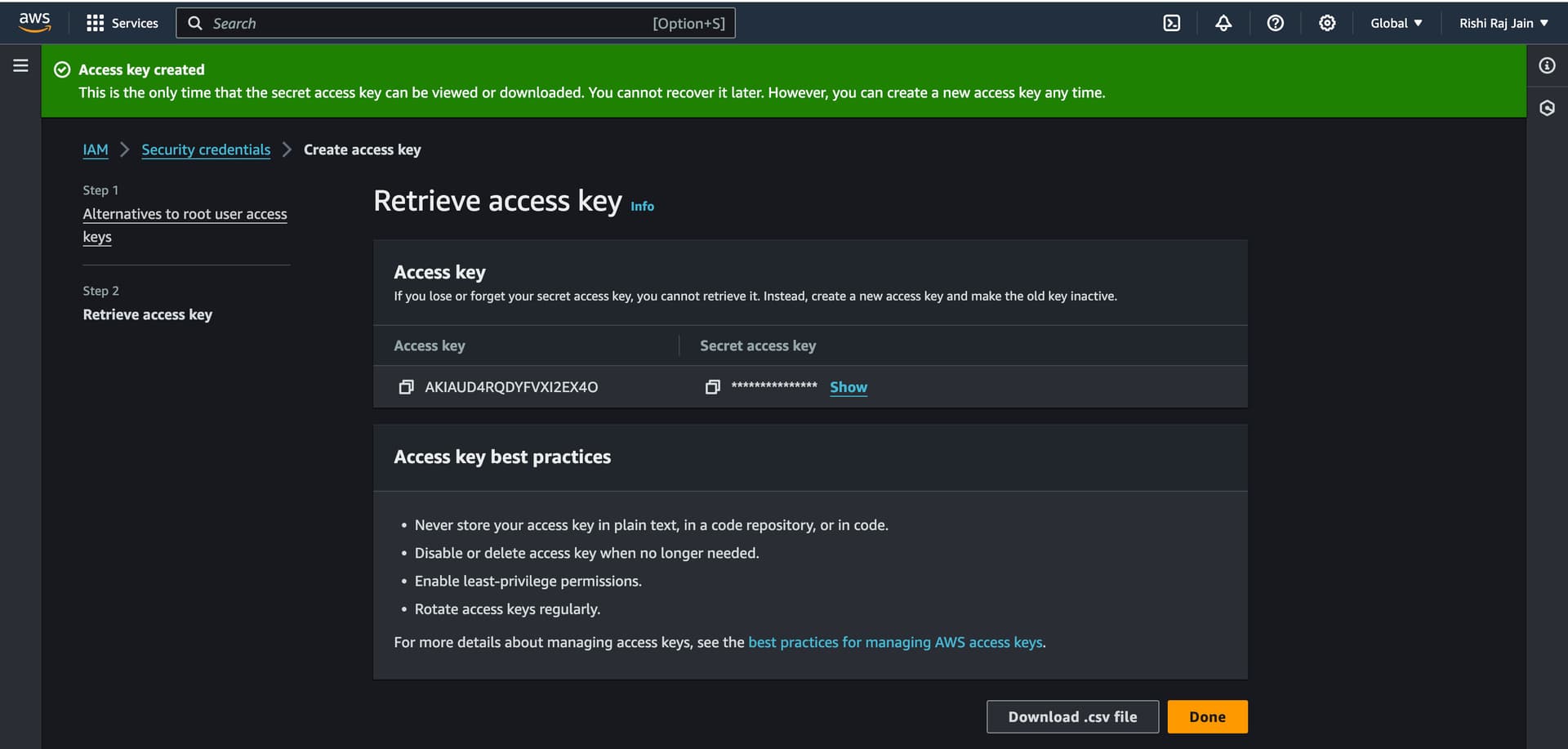 - Copy the Access key and Secret access key generated to be used as