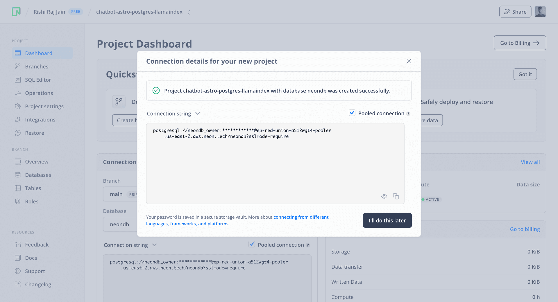 Save the connection string somewhere safe. It will be used to set the POSTGRES_URL variable later.