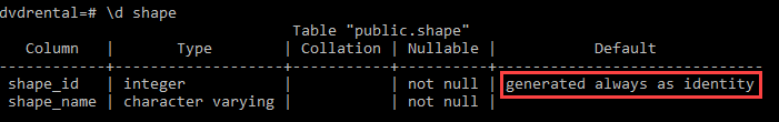 ALTER COLUMN shape_id SET GENERATED BY DEFAULT;The following command describes the structure of the shape table in the psql tool:
